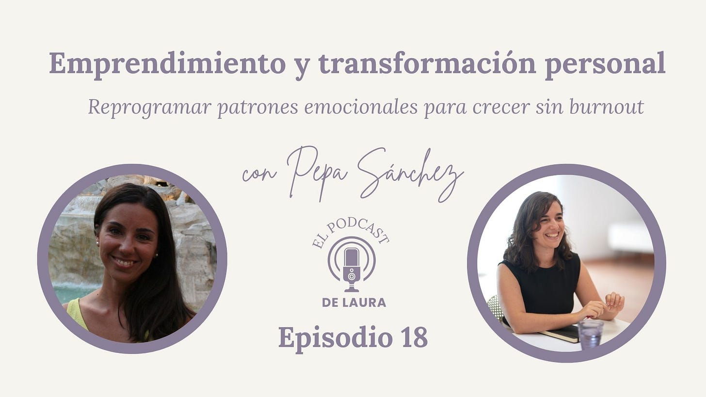 El próximo sábado 20 de diciembre a las 9.00 am, podrás disfrutar del episodio 18 de El podcast de Laura: Emprendimiento y transformación personal. Reprogramar patrones emocionales para crecer sin burnout, con Pepa Sánchez. El tema principal es la transformación personal en el contexto del emprendimiento, pero tratamos temas como el efecto de las crisis, como la pandemia, en el sistema nervioso o los miedos y creencias que limitan nuestro crecimiento en general. ¡No te lo pierdas porque son casi 90 minutos de sabiduría sobre la mente y los procesos de cambio!